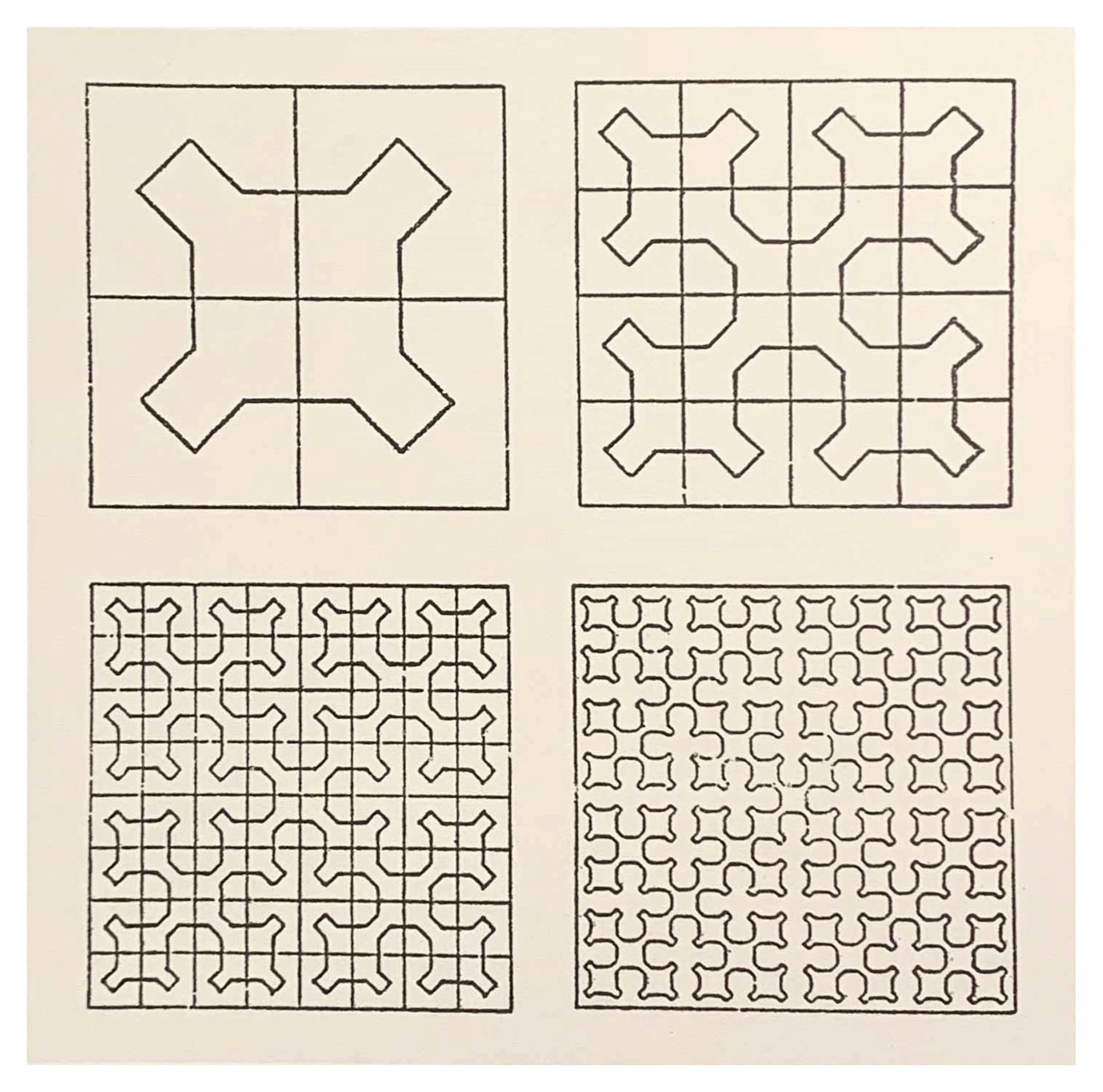In 1890, Italian mathematician Giuseppe Peano described a particular curve which would fill completely the area of a square without touching it. This "space-filling curve" (since called a Peano Curve) is a mathematical absurdity. It’s a one-dimensional entity passing as a two-dimensional figure. I'd guess it is exactly this paradox that drew artist and designer Bruno Munari to the form starting in the late 1960s. Here is a set of drawings by Munari attempting to understand the form: