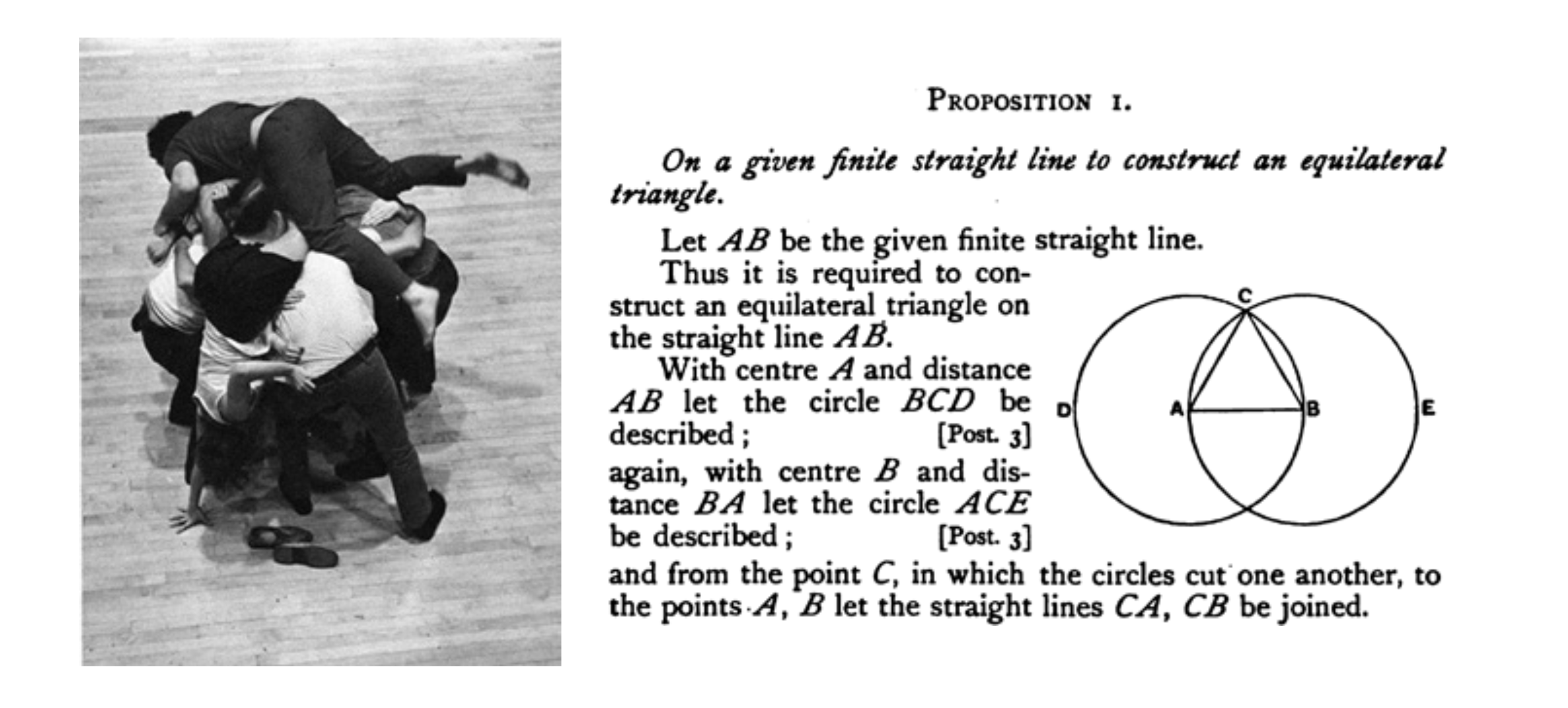 In addition to an observational acuity, Forti reveals habits of mind that in an admittedly self-serving way I have long held to exhibit a mathematical attitude. Some of these analytic tendencies are evident in the passage quoted above — at least in her choice of the words “precise,” “indeterminate systems,” and “elements.” Mathematical clues appear elsewhere in the Handbook in the form of drawings of numerals and circles. And then there is her enigmatic “proposal: 1 = pi.” She has described her early work as “more closed systems than not, arrived at by abstracting and reordering elements of one situation to create another which is of a new order.” One of these early works is Huddle, perhaps her most widely performed piece.